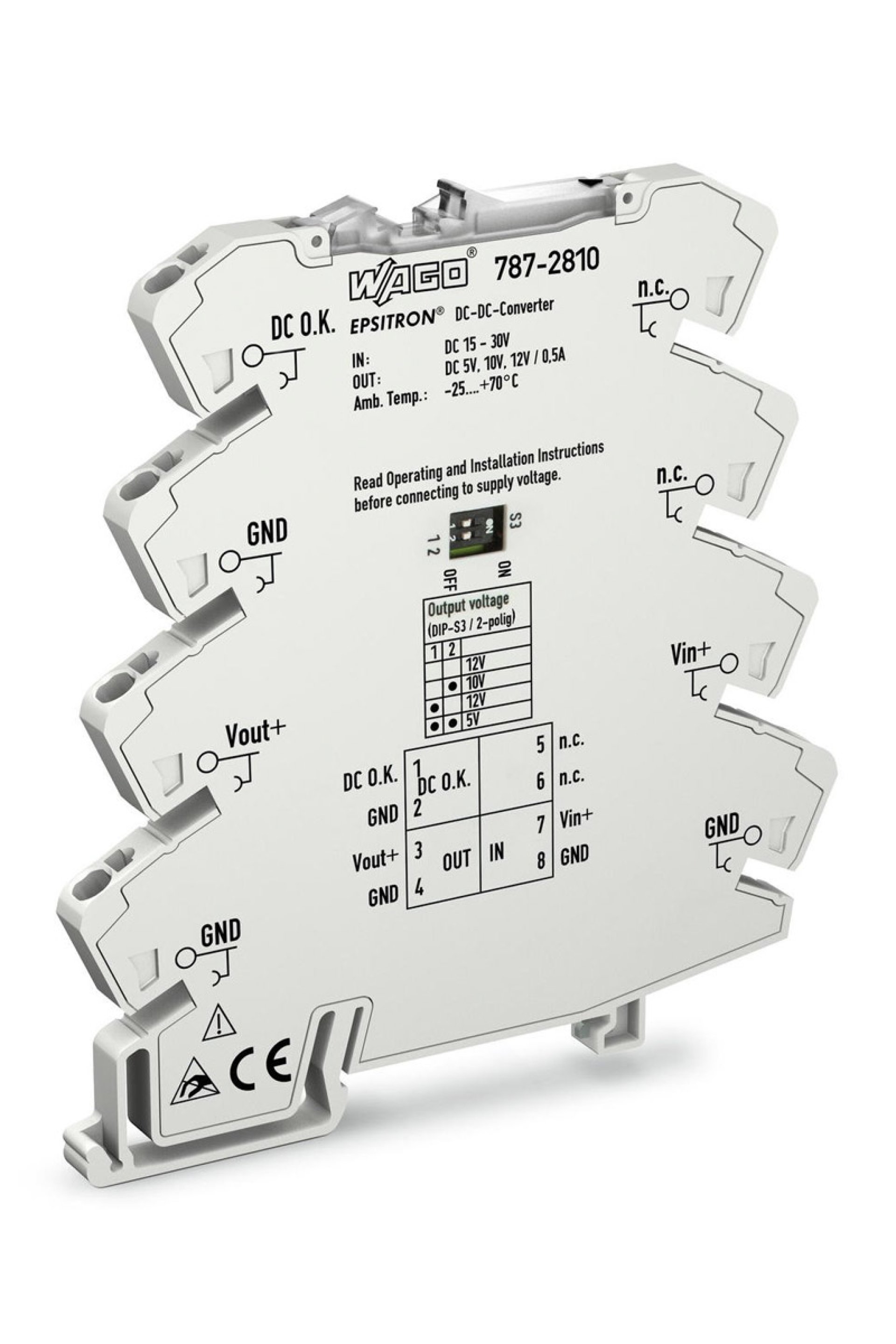 Wago Dönüştürücüler Not:Bu ürünün garanti süresi 2 yıldır. Teknik Veri Giriş Nominal Giriş Voltajı U i nom : DC 24 V Giriş Gerilimi Aralığı : DC 15 … 30 V Nominal Şebeke Frekans Aralığı : 0 Hz Giriş Akımı I i : ≤ 0,5 A Ani Akım : ≤ 0,5 A (Nominal Giriş Geriliminde) Çıkış Nominal Çıkış Voltajı U o nom : DC 5 / 10 / 12 V (DIP anahtarı ile ayarlanabilir) Çıkış Voltajı Aralığı : ±3 % Nominal Çıkış Akımı I o nom : 0,5 A Nominal Çıkış Gücü : 6 W Ayar Doğruluğu : ≤ 3 % Şebeke / Yük Yönetmeliği : ≤ 1 % Artık dalgalanma : ≤ 20 mV (tepe-tepe) Sinyal Ve İletişim Göstergeler : 1 x LED DC Uygun (Yeşil) Çalışma Göstergesi : LED Yeşil (V o ) Verim/Güç Kayıpları Güç Kaybı P v : ≤ 0,21 W (Yüksüz) Yeterlilik : 82,5 % (nominal giriş gerilimi ve nominal çıkışta) Sigorta Koruması Dahili Sigorta : Hayır Güvenlik Ve Koruma Koruma Sınıfı : III Koruma Sınıfı : IP20 Koruma Tipi Hakkında Not : EN 60529'e göre Ters Gerilim Koruması : Evet Geri Bildirim Voltajı : ≤ DC 16 V Kirlilik Derecesi : 2 Kısa Devre Koruması : Evet Yüksüz Emniyeti : Evet Paralel Çalışma : Hayır Seri Bağlantı : Hayır MTBF : > 1,800,000 Saat Bağlantı Verisi Jumper Slot Sayısı : 8 Bağlantı Teknolojisi : CAGE CLAMP ® S Tek Damarlı Boylar : 0,08 … 2,5 mm² / 28 … 14 AWG İnce Bükümlü Kablolar : 0,34 … 2,5 mm² / 22 … 14 AWG Sıyırma Uzunluğu : 9 … 10 mm Geometrik Veriler Genişlik : 6 mm Yükseklik : 94 mm Din-35 Rayının Üst Kenarından Uzunluk : 97,8 mm Mekanik Veriler Montaj Tipi : DIN 35 Ray Malzeme Verileri Ağırlık : 36,4 g Çevresel Gereklilikler Çevreleyen Hava (Çalışma) Sıcaklığı : -25 … +70 °C Çevreleyen Hava (Depolama) Sıcaklığı : -40 … +85 °C Bağıl Nem : ≤ 95% (Yoğunlaşmaya İzin Verilmez) Kapasite Düşüşü : Değer Kaybı Yok Standartlar/Spesifikasyonlar Uygunluk İşareti : CE Standartlar/Spesifikasyonlar : EN 61000-6-2